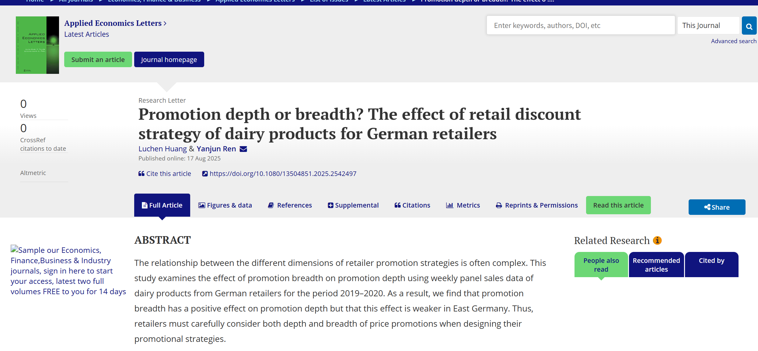 团队博士生黄禄臣围绕食品价格促销策略发表最新研究