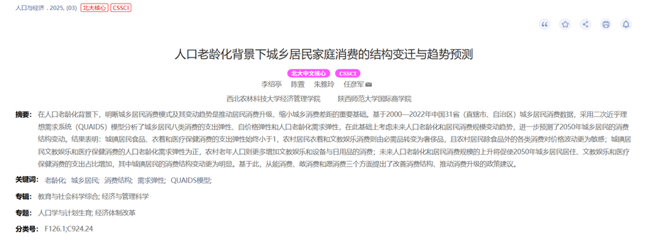 近期,西北农林科技大学bwin必赢唯一官方网站任彦军教授课题组在《人口与经济》发表题为“人口老龄化背景下城乡居民家庭消费的结构变迁与趋势预测”的学术文章,任彦军教授为论文通讯作者,博士生李绍亭为论文第一作者,博士生陈萱和陕西师范大学朱雅玲副教授为论文共同作者。