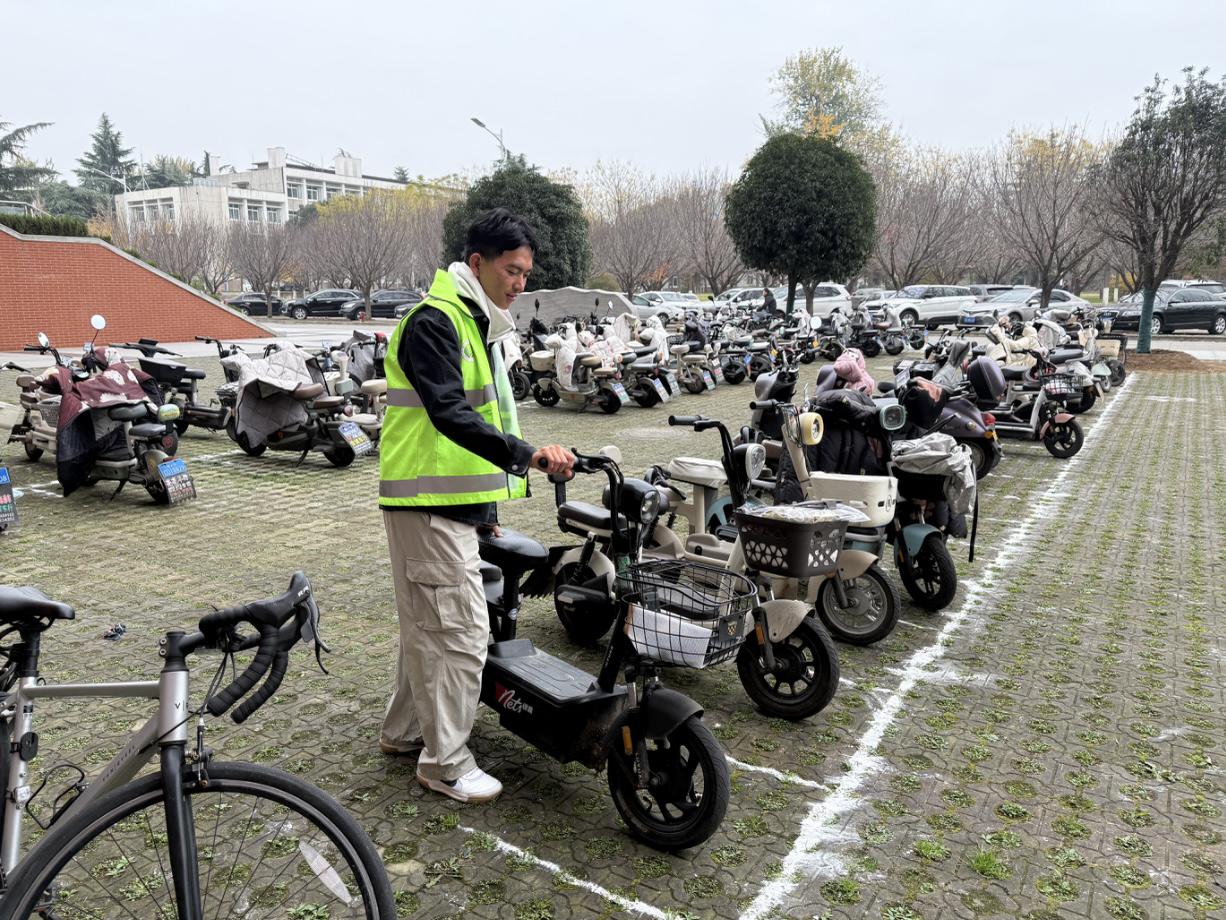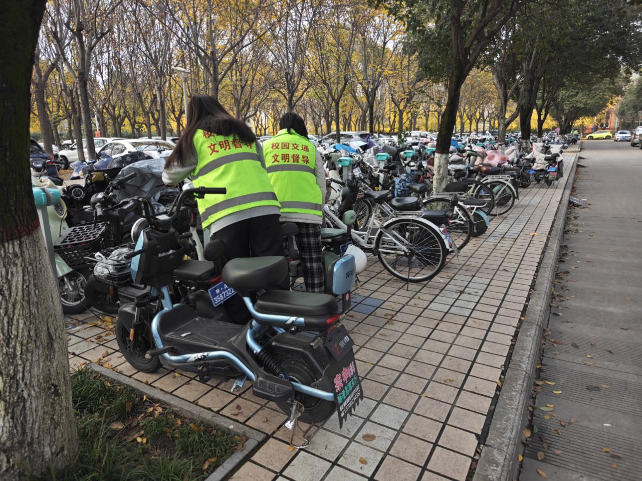 活动期间,志愿者们秉持“奉献、友爱、互助、进步”的志愿精神,以高度的责任感投入督导工作,精准对接上下课、就餐等高峰时段,准时到岗履职,化身校园交通安全督导员,全力协助保卫处开展电动车专项治理工作。在各教学楼出入口及电动车停放区、餐厅周边等人车交汇关键点位,志愿者们主动帮助师生规范停放车辆,及时清理占用人行道的电动车,切实保障校园道路畅通有序。